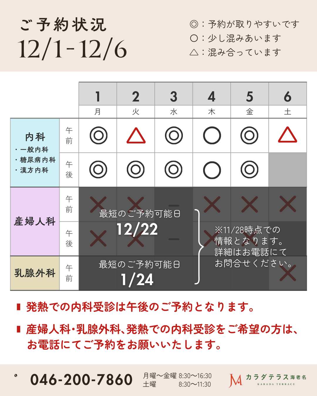 12/1(月)~12/6(土)の診察空き状況をご案内いたします。 ※11/28時点(毎週更新)▶こちら