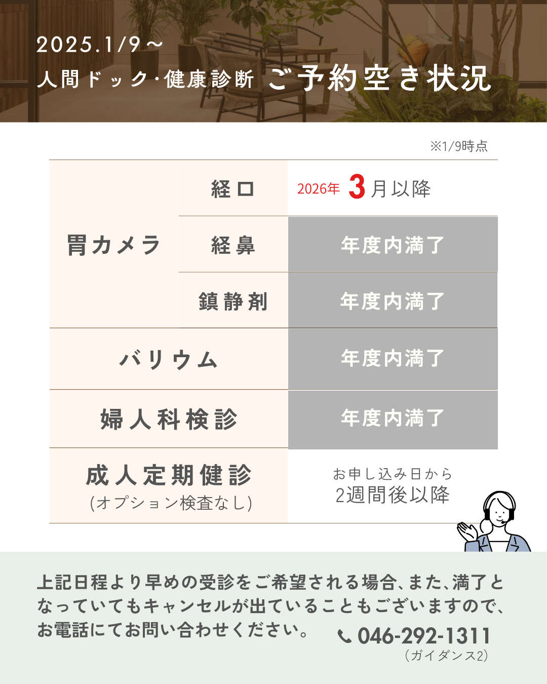 上記日程より早めの受診をご希望される場合や、満了となっている場合でも、キャンセルが出ていることがございますので、お電話にてお問い合わせください。