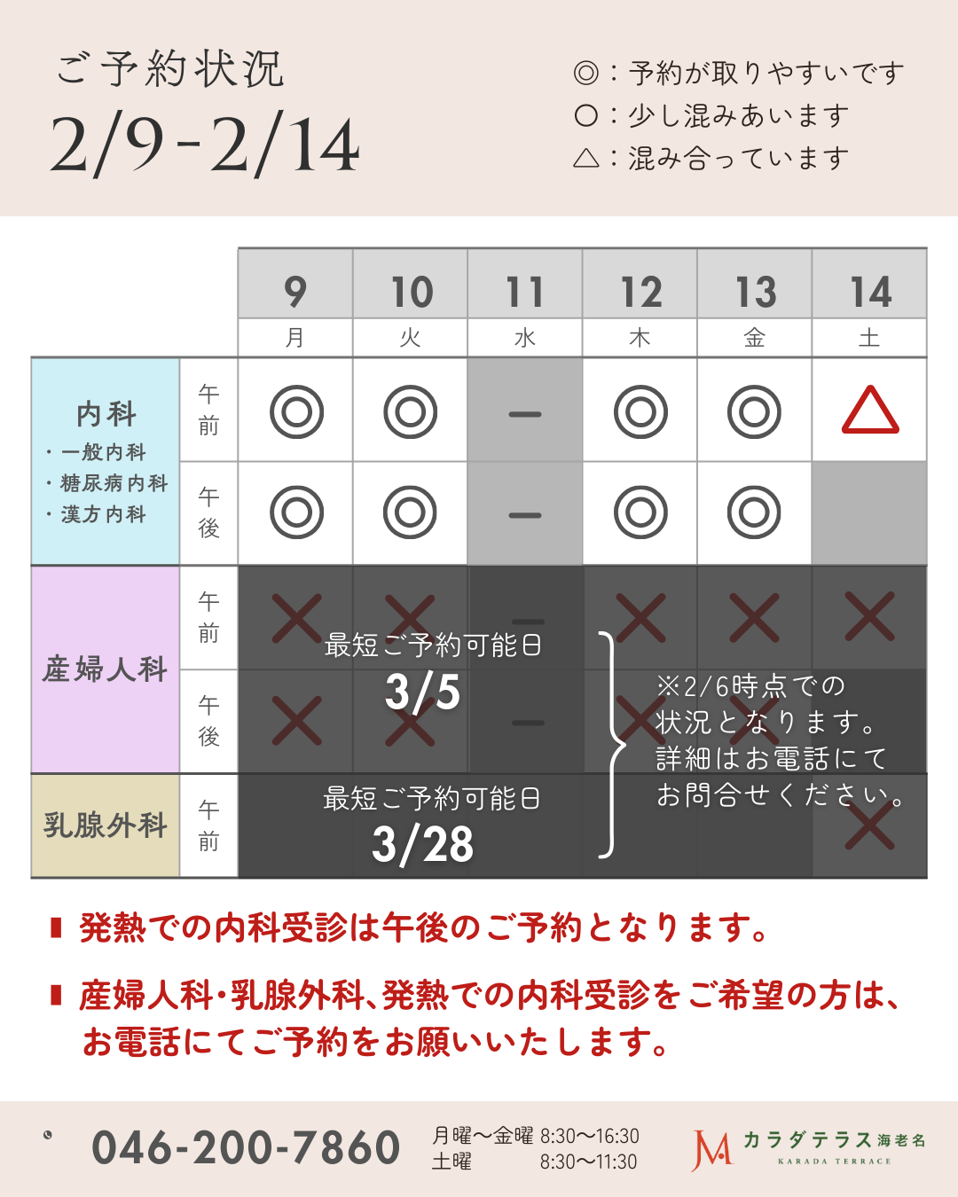 2/9(月)~2/14(土)の診察空き状況をご案内いたします。 ※2/6時点(毎週更新)▶こちら