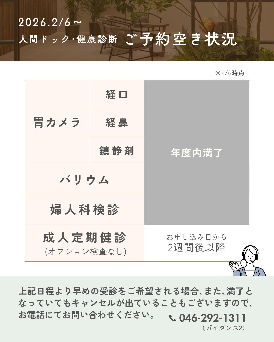 各検査、ご予約可能な日程のご案内です。※2/6時点(毎月更新)▶こちら